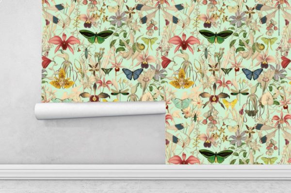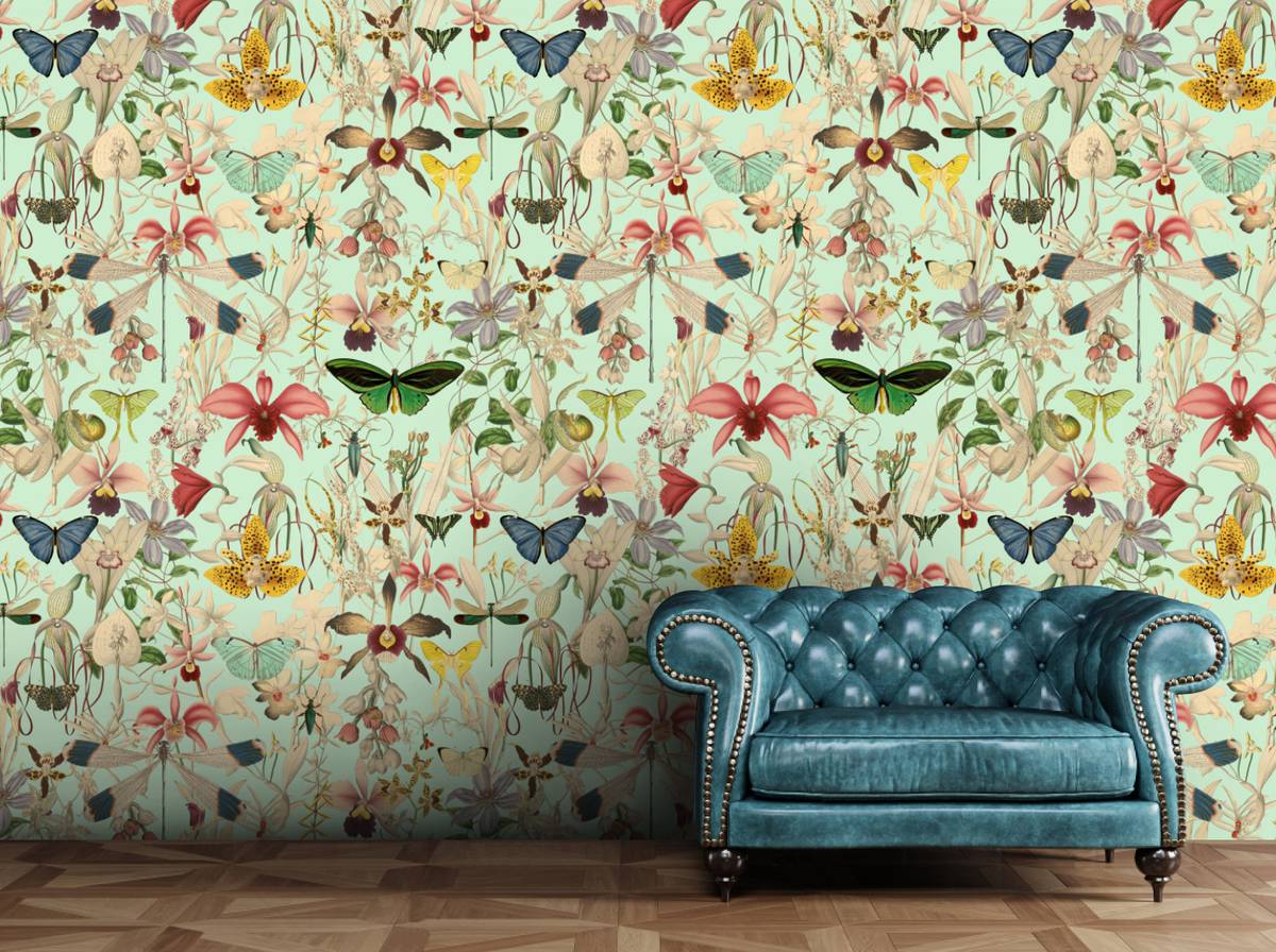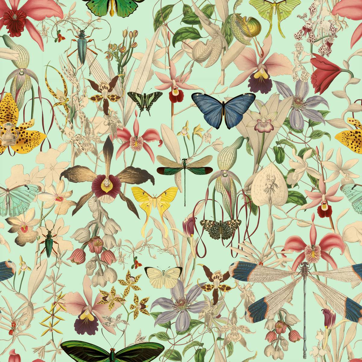 Ein tropischer Garten mit Orchideen, Schmetterlingen und wunderschönen Insekten. Aufregende Muster, Farben und Formen der Natur zum Bestaunen und zum Tagträumen. Was für eine Augenweide und eine Bereicherung für jede Wand.
