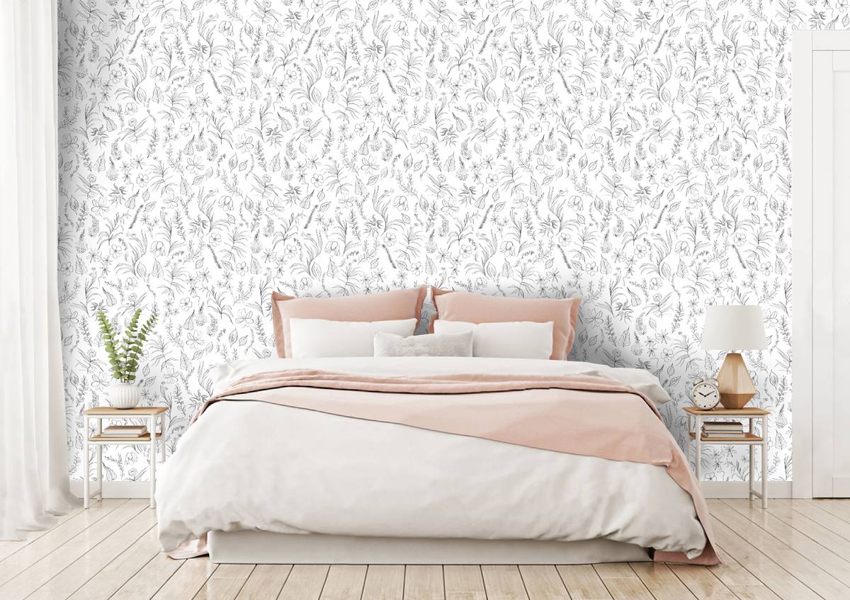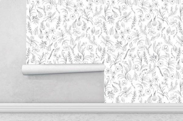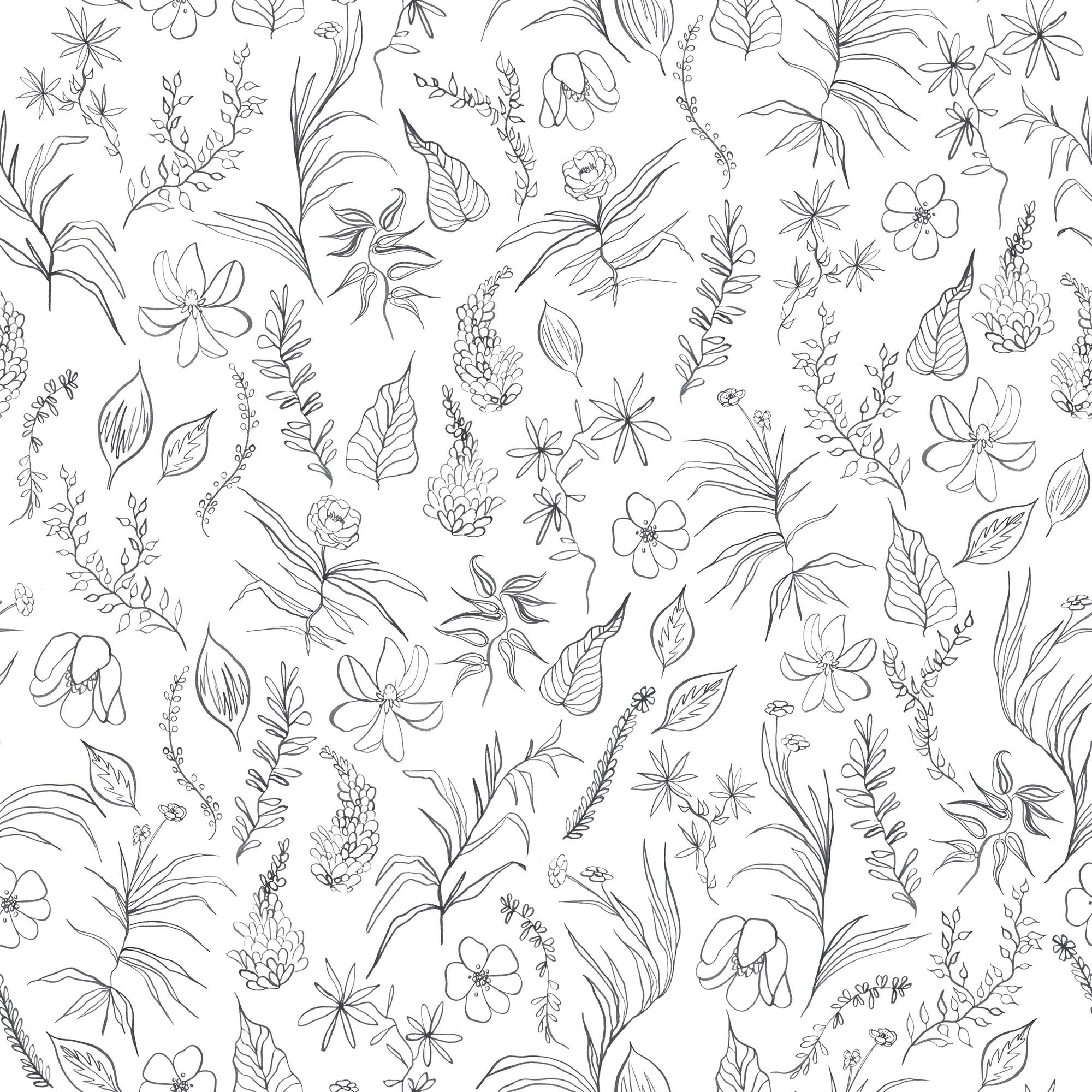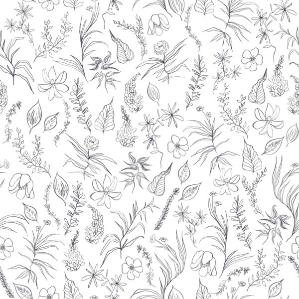 Auf dieser bunten Frühlingsblumenwiese wachsen handgezeichnete Blumen und Gräser und ergeben zusammen ein zartes Streublumenmuster. Dieses Muster verleiht jedem Raum Leichtigkeit und lässt sich wunderbar mit jeder Art von Möbeln kombinieren.