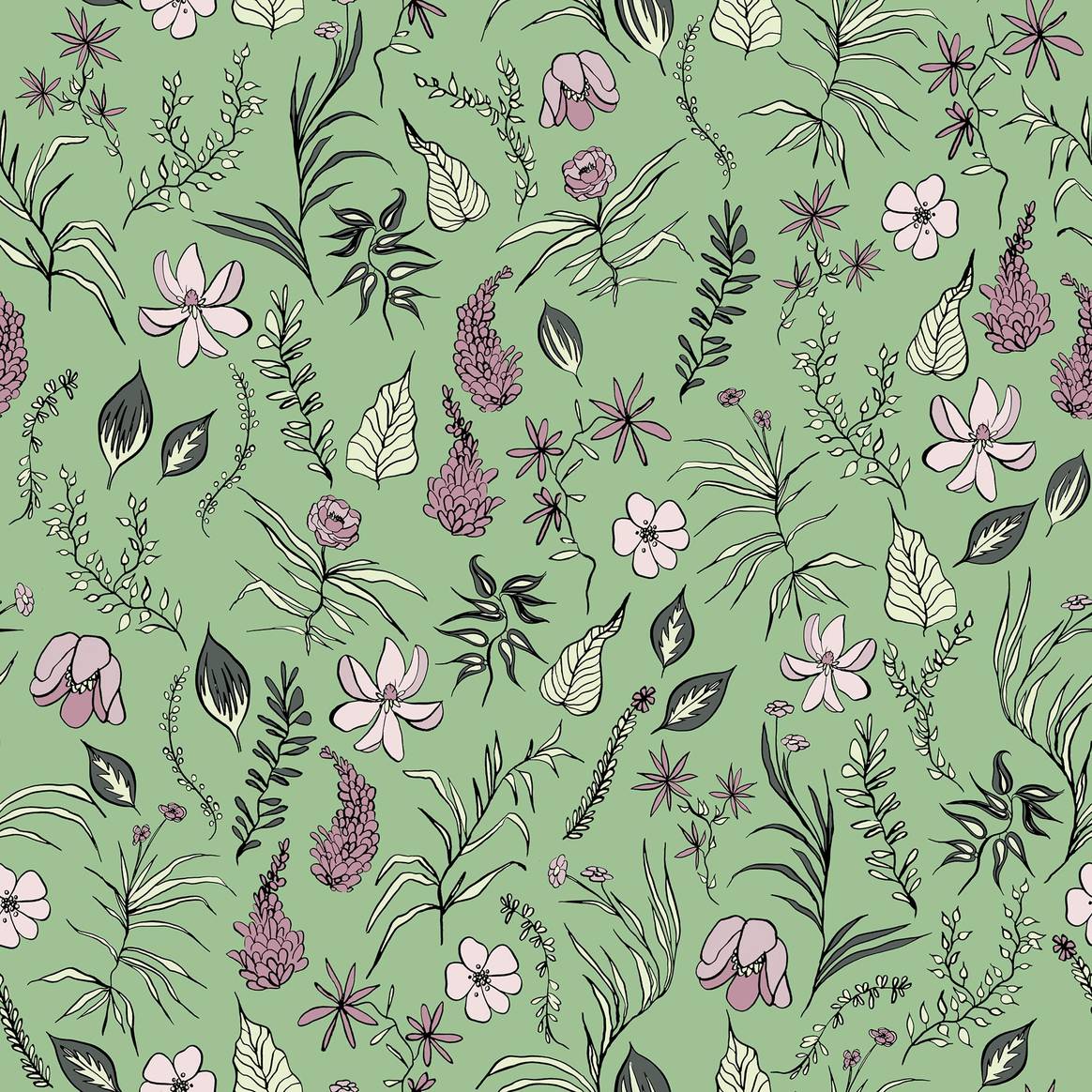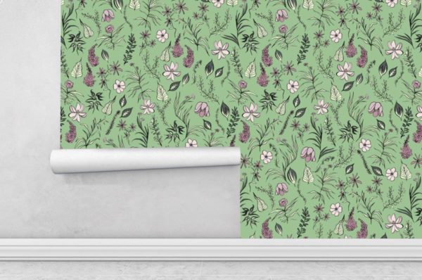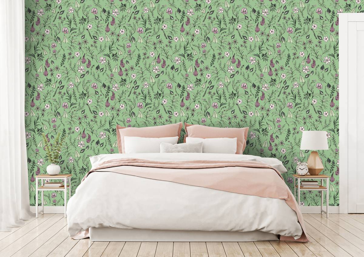Auf dieser bunten Frühlingsblumenwiese wachsen handgezeichnete Blumen und Gräser und ergeben zusammen ein zartes Streublumenmuster aus Pastelltönen. Dieses Muster verleiht jedem Raum Leichtigkeit und lässt sich wunderbar mit jeder Art von Möbeln kombinieren.