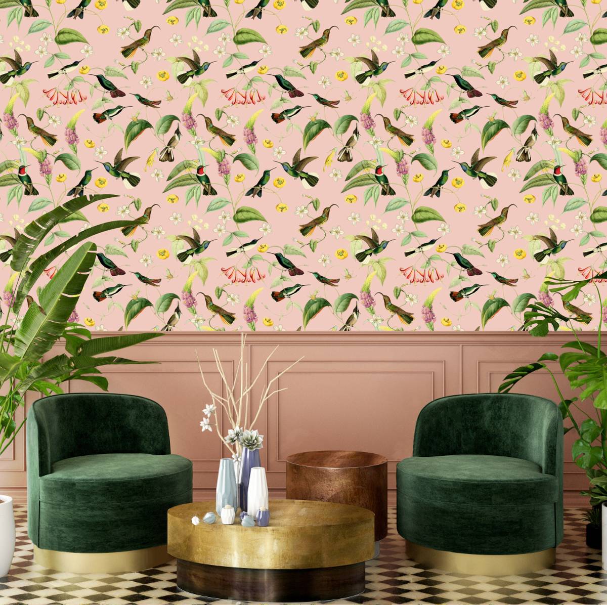 Dieser Garten brummt! Viele schnelle Flügelschläge von kleinen eleganten Vögeln, die geschäftig hin und herflitzen machen Geräusche wie grosse Hummeln. Hier duftet es nach Honig und Blütennektar und jeder dieser kleinen Flitzer möchte seinen Energiehaushalt an den Blüten wieder auffüllen. Was für ein bezauberndes Muster mit einer immerwährenden stimmungsaufhellenden Wirkung!