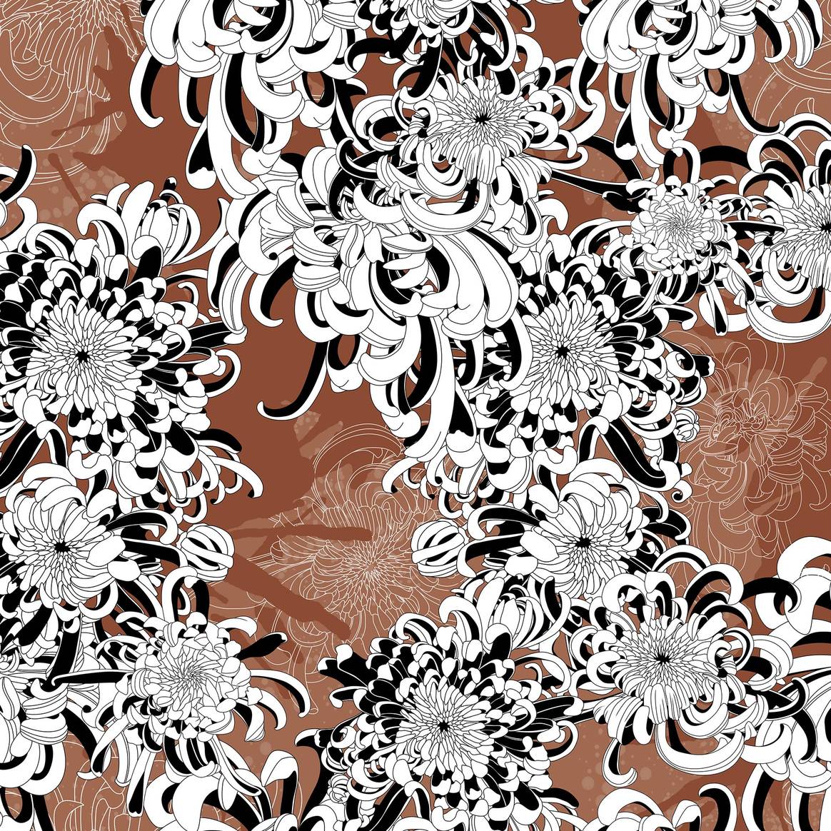 Schwarz-Weisse Crysanthemen mit groben Tintenflecken – ein verspieltes und gleichzeitig opulent elegantes Muster, mit einer edlen und teuren Wirkung. Es verlangt Aufmerksamkeit – die es aber in jedem Fall sofort belohnt!