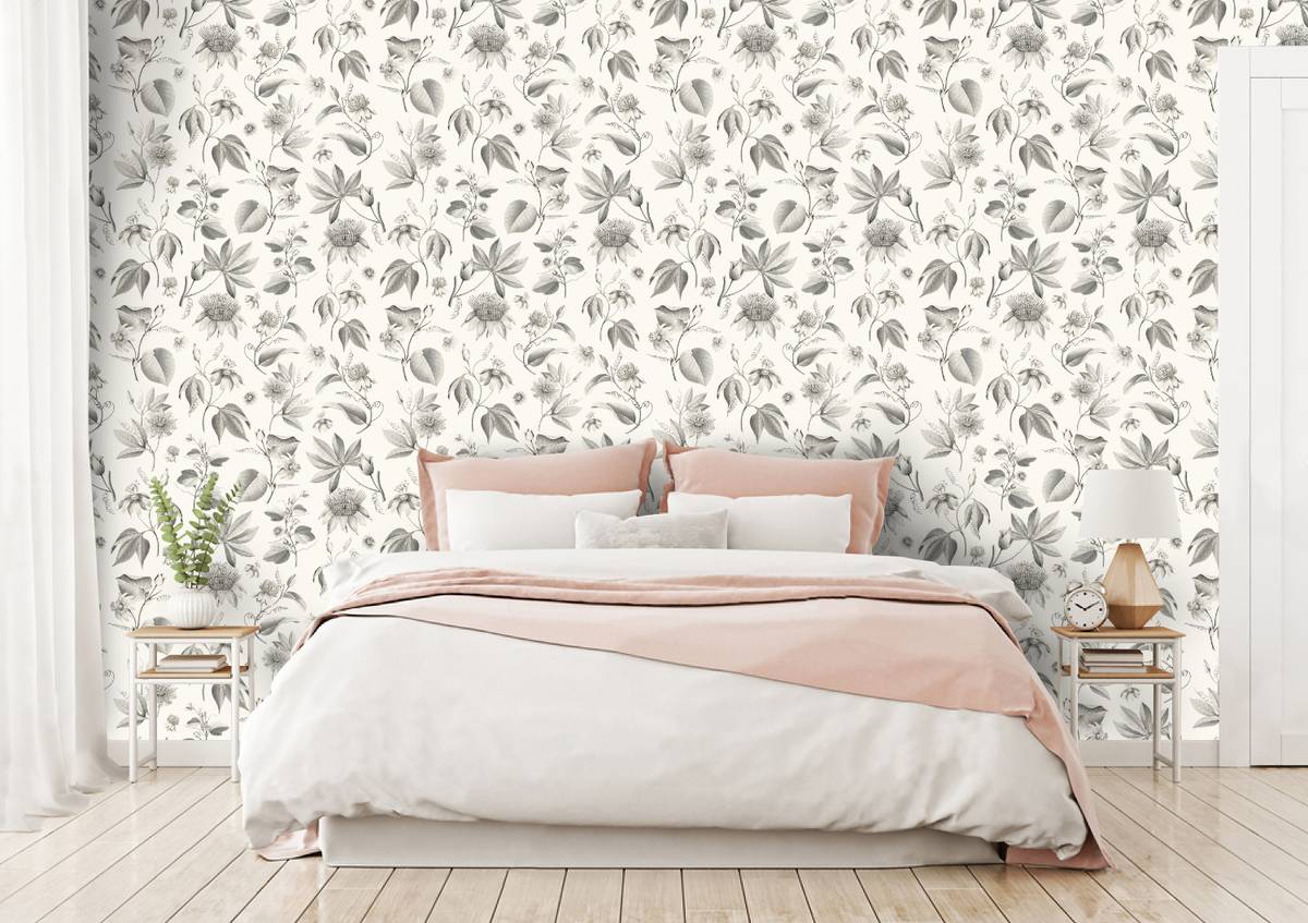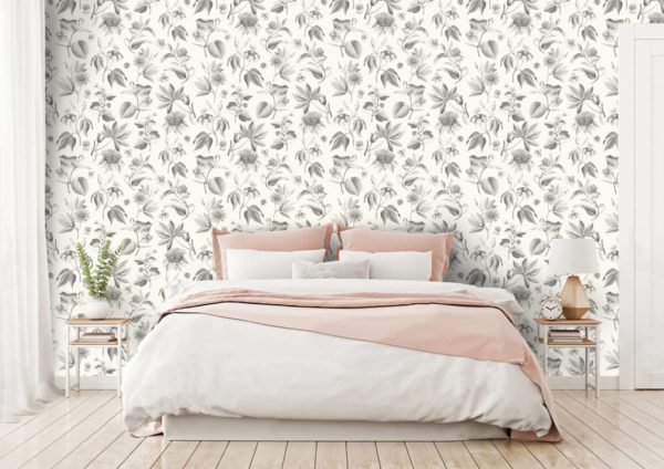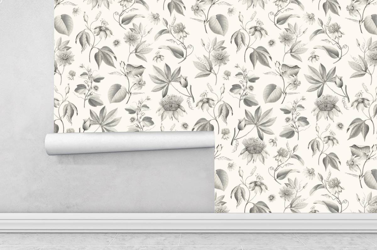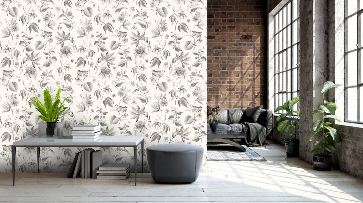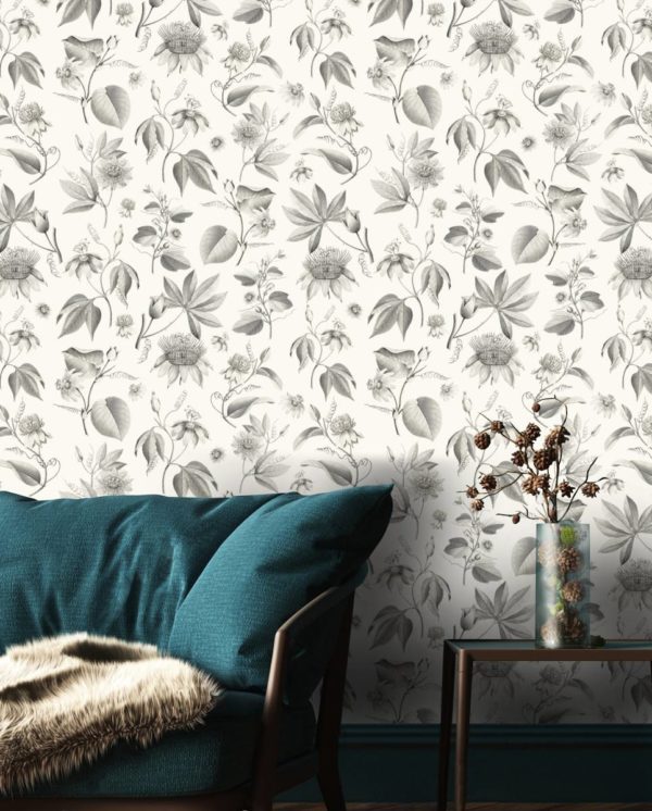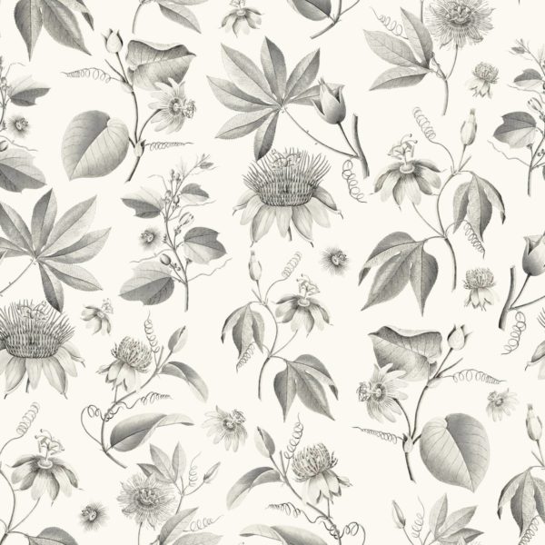 Zarte Ranken winden sich hier über Deine Wände. Aufregend schöne grosse Passions-Blüten in fein gearbeiteten Kupferstich-Zeichnungen. Die Wirkung ist so edel und so elegant, und dieses Muster lässt sich leicht mit allen Einrichtungsformen kombinieren.