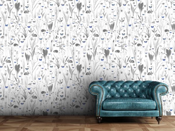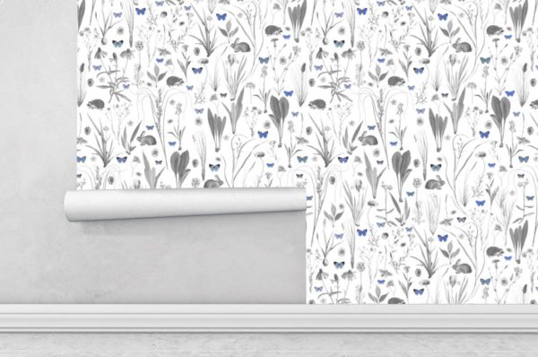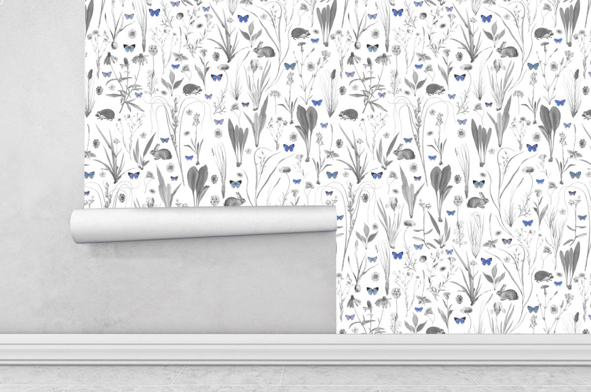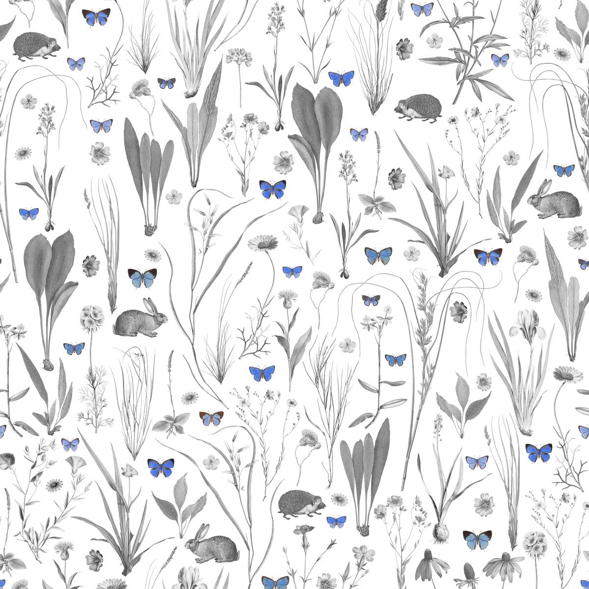Hasen und Igel verstecken sich inmitten einer Blumenwiese mit Schmetterlingen.