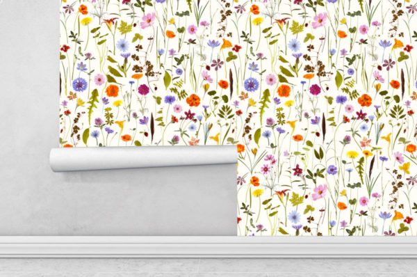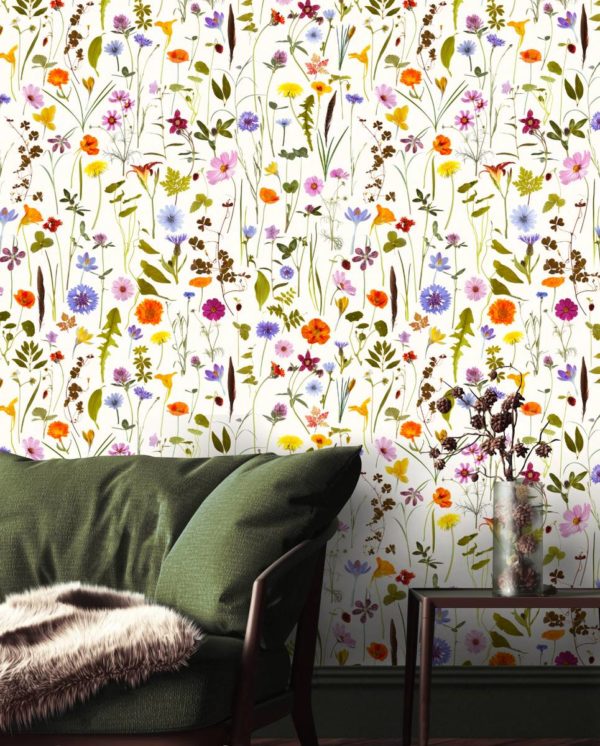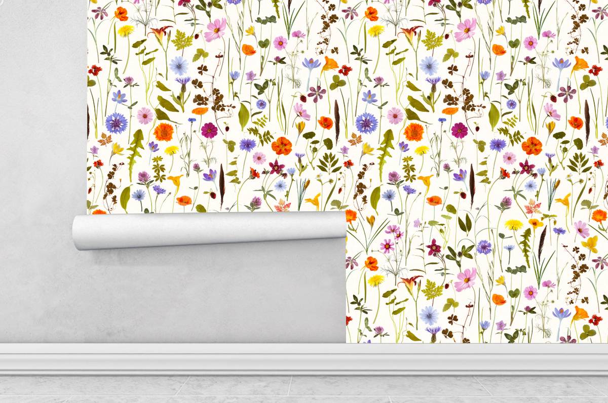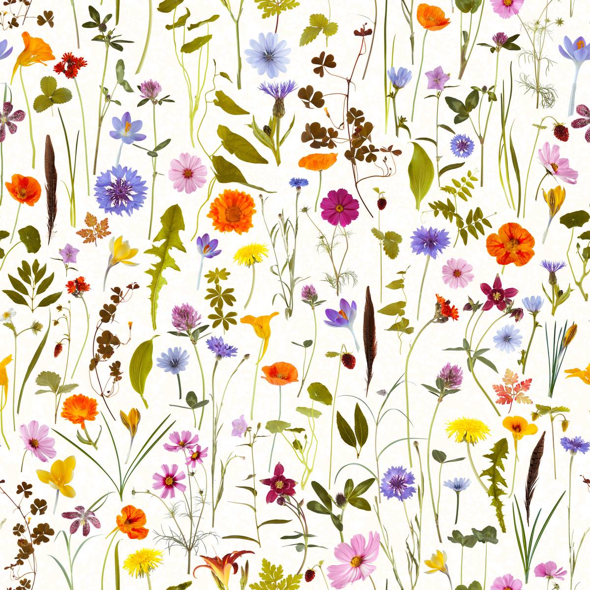 Auf dieser bunten Frühlingsblumenwiese wachsen Blumen und Gräser aus dem Garten und ergeben zusammen ein farbenfrohes Streublumenmuster. Dieses Muster verleiht jedem Raum Leichtigkeit und lässt sich wunderbar mit jeder Art von Möbeln kombinieren.