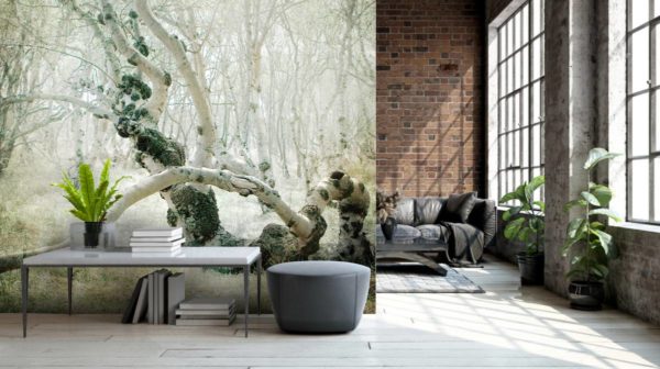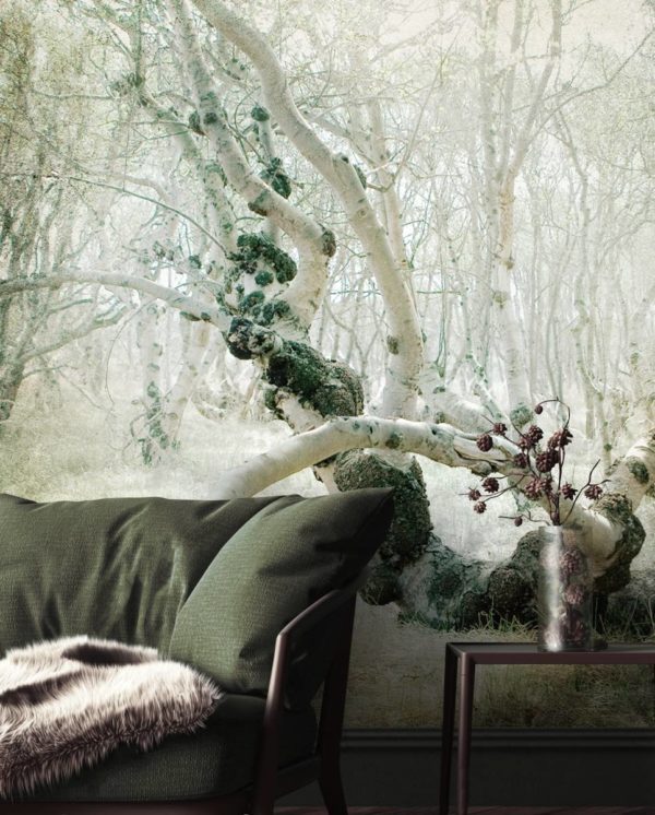 Eigenwillig und urig geformte Birken wachsen in diesem hellen, nebeligen Wald. Eine atmosphärische Stimmung verbreitende Landschaft im vintage Stil. Ein ganz besonderer Ort zum Durchatmen.