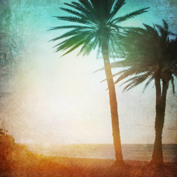 Romantische Aussichten bietet dieser Blick auf den Sunset Beach am North Shore von Oahu. Das Surferparadies von Hawaii bei Sonnenuntergang im romantischen Vintage-Stil.